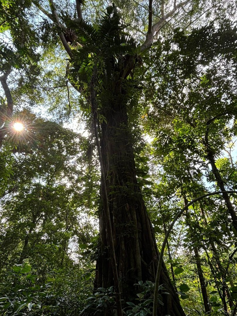 再走几步路,会看到一些被砍断的树干。老师解释道,这些大树在倒下后,砍断而没有被移除是为了维持甲虫的生态系统。据说,曾有一位探险家就在这些树干上,发现了五十多种前所未见的甲虫。继续前行,会发现有些大树的枝干上会结满无花果。它们攀附在大树的枝干上,竟然也可以抵达无比高的高度。大树从土壤中汲取养分,为其他植物提供生长的环境。即使倒下,它们的遗骸依然成为无数生物的庇护所。若将大树和人作比较,大树的伟大与坚韧远胜过大多数人。