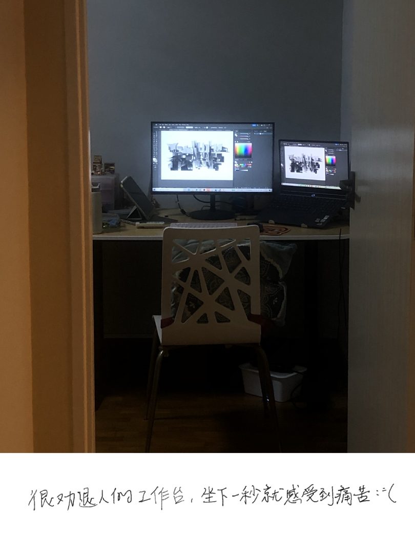 椅子2:家里的工作座椅积了尘,挺直腰背这种标准坐姿给我一种自我宣战的意味,叫人难以亲近。像我这种半软体动物只爱窝在床上办公,给自己一个打盹并惊醒的机会,来回反复。但坐/趴/窝的时间长了,也不太得劲,始终不是一个理想的座椅,尚且不说还得承受旁人担忧的目光。