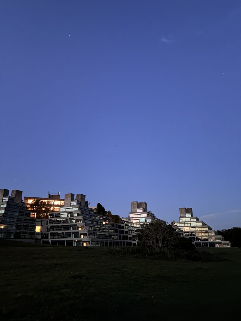 晚上在东安格利亚大学的湖泊边散步,藏蓝的天空下,白雾弥漫,树林湿冷得让人感到疏离。我抬头看一道浅浅的银河系轨迹依稀浮现,亮眼得令鼻头发酸。我持续抬着头,注视那些星辰,深怕有什么从我身上剥落下来。在各种蓝色形态中,如果要为此刻命名,我想诺里奇的冬天是深不见底的午夜蓝。